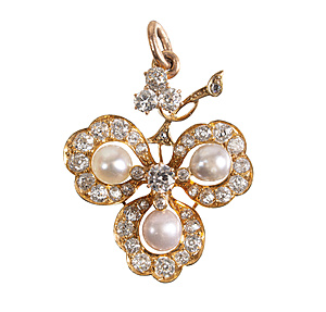 Pendant circa 1870/80, ROSÈGOLD 750/000, 39 old-cut diamonds approx. 1.8 ct in a brilliant white, few/almost no inclusions (high cut, á jour sawn), the stylized blossoms contain 3 pearls, approx. 23.6 x 32.6 mm, with box, total 4.8 g, fine work !