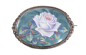 Brooch, Pforzheim, circa 1910, SILVER 800/000, color enameled rose blossom on guilloché ground, floral frame, approx. 46.6 x 32.4 mm