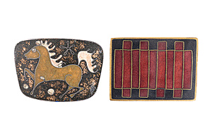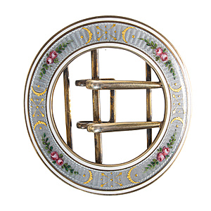 Gürtelschließe, FRANKREICH um 1900, transluziedes Emaille in zartem Grauton, im Kranz Rosendekor mit Blattwerk, dazwischen Feingoldornamente, ca. 60,8 x 63,6 mm, sehr schöner Erhaltungszustand !