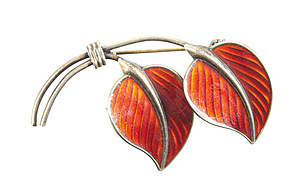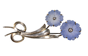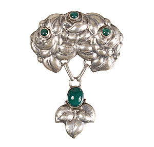 Brosche, JUGENDSTIL um 1900, SILBER 830/000, signiert S.F. (Sarhus Christian, Fogh Kopenhagen), 3 kl. grüne Calcedone, abgehängtes Blatt mit weiterem Calcedon, plastisch ausgearbeitete Oberfläche mit Blüten/Knospen u. Blattwerk ausgearbeitet, ca. 51,7 x 71,6 mm