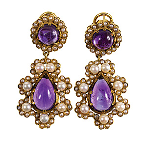 Earrings, (pin with omega clip), GG 585/000, amethyst, 14 Akoja pearls D = 2.5 mm, H = , total 23.2 g