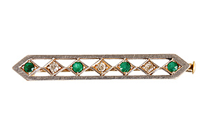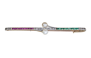 Pin, ART-DECO circa 1930s, GG 585/000, central 2 pearls (probably natural pearls), 17 diamond roses (set in PLATINUM) along the length, set with 9 emeralds on one side and 9 rubies (faceted) on the other side, l = 72.0 mm, total 5.3 g