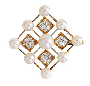 Sehr feine Brosche, spätes ART-DECO, GG 585/000, 4 im Quadrat angeordnete Altschliff-Diamanten ca. 0,9 ct schönes weiß mit wenig Einschlüssen, sehr schöne Brillanz, hoch geschliffen, 9 schachbrettartig angeordnete Akoja-Perlen, Brosche: ca. 20,0 x 20,0 mm
