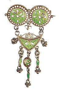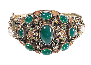 Bracelet in the style of the 2nd half of the 19th century, SILVER, the front set with 9 green stones, 2 pearls on the sides, in between small blossoms and stylized acanthus leaves, coloured enamel lacquer, inside approx. 63.0 x 57.5 mm, simple box clasp with safety chain, total 79.9 g