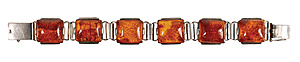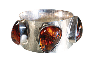 Armreif VINTAGE, SILBER 835/000, signiert GK im Wappenschild (Gustav Kramer, später Fischland), umlaufend 5 dekorative Bernsteine, Reif leicht gekehlt und mit Hammerschlag verziert, B = 35,6 mm, innen D = 61,5 cm, total 89,7 g