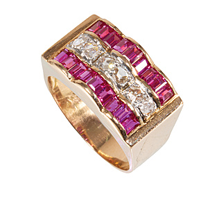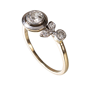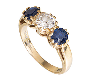 Ring, ENGLAND 1st half 20th century, GG 750/000, signed J.C.M., central old-cut diamond approx. 0.95 ct w/i-si (D = approx. 6.3 mm), each side with 1 sapphire totaling approx. 1.7 ct (faceted, with traces of wear), RW approx. 59, total 5.7 g