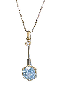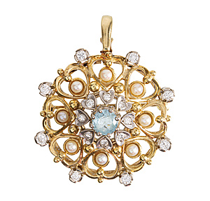 Heavy brooch/pendant, GG 585/000, signed J.KA, centrally 1 aquamarine approx. 0.8 ct, in graduated wreaths 16 brilliant-cut diamonds, total 0.64 ct tw-vsi, also 8 Akola pearls, d = 35.4 mm, total 15.8 g