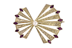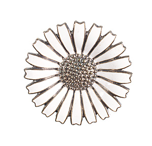 Brosche THEODOR FAHRNER, ART-DECO um 1920, SILBER 935/000, signiert TF, zentraler Amethyst ca. 12,0 ct (facettiert), in den umlaufenden Blüten 8 weitere kl. Amethyste, ca. 42,2 x 44,5 mm. Literatur bei Arnoldsche THEODOR FAHRNER SCHMUCK ähnliche S. 186