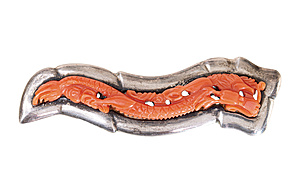 Brosche mit stilisiertem Drachen, wohl ASIEN Mitte 20.Jhd., SILBER, gravierte Koralle in einem gewellten Rahmen, L = ca. 58,0 mm