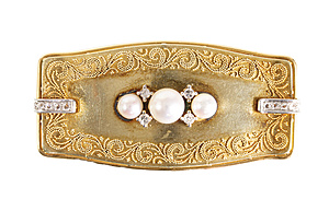 Brosche 1.Hälfte 20.Jhd., GG 585/000, 3 Akoja-Perlen D = 4,5-6,2 mm, 4 Diamanten weiß, 10 Diamantrosen weiß (weiß gefasst), leicht gespannte Oberfläche mit floral granuliertem Fries ca. 2500 kl. Kugeln, ca. 47,0 x 23,0 mm, total 10,0 g