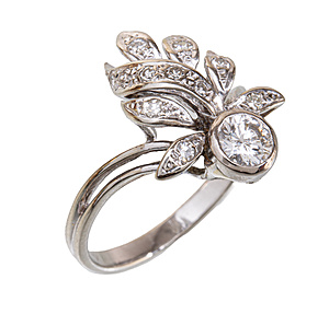 Ring, WG 585/000, 1 brilliant-cut diamond ca. 0.35 ct w-si/p, 11 8/8-cut white diamonds set in stylized foliage, RW ca. 53.5