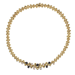 Necklace, GG 585/000, 11 white and dark pearls in the display area D = 5.0-6.0 mm, structured 1/2 spheres form the decorative chain, box clasp with safety chain, L = 44.5 cm, plus extension element, L = 11.0 mm, total 42.1 g