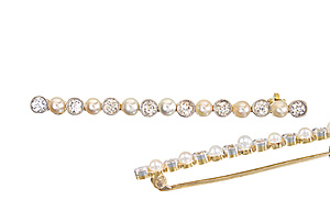 Nadel 1.Hälfte 20.Jhd., GG 750/000, signiert (unleserlich), 8 Altschliff-Diamanten ca. 0,32 ct schönes weiß mit sehr guter Brillanz (weiß gefasst), dazwischen 7 Perlen D = 2,6-2,7 mm, L = 42,5 mm