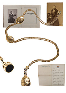 Handgefertigte Fuchsschwanzkette mit zwei ovalen Schiebern, GG 750/000 (geprüft), am Ende ungravierter Onyx (für späteres Siegel), L = 65,0 cm, total 20,2 g. Die Kette ist ein verbrieftes Geschenk Ihrer Königlichen Majestät Margherita (Italien) an den bekannten Musiker und Virtuosen Robert Heckmann. Das Dank-Schreiben im Auftrag der Königin auf königlichem Papier vom 14. April 1886 in französischer Sprache beinhaltet einen Geldbetrag für das Quartet und wurde durch einen Cavalliere (Ehrenritter Herr de Villamarine) überbracht ! Anlage: Königliches Schreiben auf Französisch; Italienischer Begleittext; Ein Foto von Robert Heckmann u.ein kleines Büchlein: ROBERT HECKMANN Ein Lebensbild