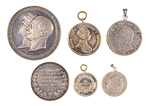 Lot: Coins/medals, SILVER, partly worked as pendants, 1 x Friedrich August Grand Duke-Elisabeth Grand Duchess of Oldenburg on the occasion of her marriage anniversary, d = 50.7 mm; 2 pendants: 1 x King of Saxony from 1869, d = 33.0 mm; 1 x Emperor of Austria