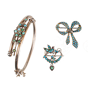 Lot BIEDERMEIER Schmuck, SILBER 800/000 (reif geprüft), Schmuckstücke mit Türkisen ausgefasst, Schleife zusätzlich mit Markasiten besetzt, Schleife ca. 30,0 x 32,2 mm; Brosche mit einer TAUBE u. abgehängtem Herz H = 31,2 mm; Armreif mit Kastenschloss u. Sicherheitskettchen, innen ca. 59,5 x 49,0 mm
