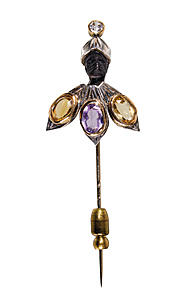 Tie pin, VICTORIAN 2nd half 19th century, SILVER, BLACKAMOUR, 2 citrines and 1 amethyst, the top of the headpiece surmounted by a white diamond weighing approx. 0.12 ct, all stones set in gold, l = 61.2 mm