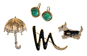 Lot Modeschmuck: Metall gelbfarben, 1 HUND, sig. D`ORLEAN; 1 Paar Manschetten-Knöpfe, sig. MARC LUBERA; 1 REGENSCHIRM, sig. BURBERRYS; 1 Brosche, sig. TRIFARY, ca. 64,0 x 37,8 mm, schwarzer Emaillack, farbloser Strassbesatz