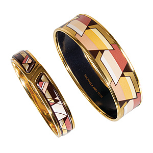 Lot: 2 bangles, gold-coloured metal, signed MICHAELA FREY, hoops in predominantly beige/brown tones, 1 hoop, inside D = 67.2 mm, W = 19.5 mm; 1 hoop to open, inside approx. 57.2 x 48.5 mm