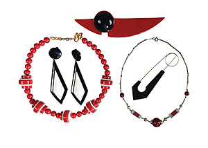 Lot Modeschmuck; ART-DECO/ART-DECO Stil, 1 Nadel, Bakelit/Stahl, L = 10,4 cm; 1 Brosche in leuchtendem rot mit einem schwarzen Auge, L = 14,0 cm; 1 Kette (Bengel ?), zentral 1 Kugel D = 15,8 mm, L = ca. 42,0 1 Paar Ohrhänger H = ca. 98,5 mm; 1 Kette in rot und weißen Farbtönen, L = 40,0-45,5 cm