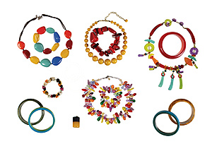 Lot: Colorful costume jewelry, predominantly plastic, 5 bangles, D = 64.5-67.0 mm; 4 pcs. pull bracelets; 4 necklaces, L = 48.5-58.5 cm and 1 pendant