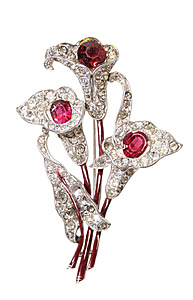 Brooch BLUME, VINTAGE 1930/40s, white metal, signed: TRIFARI, DES. Pat. no. 129551, red colored glass in the flowers, colorless glass over the surface, all faceted, l = approx. 67.3 x 45.5 mm, stem lacquered, (barrel part missing)