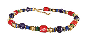 Decorative necklace, yellow-colored metal, signed WAZAK PETRA, coral- and lapis-colored elements. lapis-colored elements, interspersed with rondels with blue rhinestones, extension chain, L = approx. 44.5-50.0 cm. forms and symbols from art history are reinterpreted with unique sensitivity. The artist has worked with major fashion houses such as Dior, Chanel and Gucci.