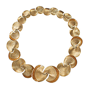 Dekoratives Collier von Trifari (vermutlich von Kunio Matsumoto aus den 1980er Jahren), Metall goldfarben, signiert TRIFARI, kreisförmige muschelige Elemente, im Verlauf, vorne H = 38,5 mm, L = ca. 50,0 cm, sehr ausgefallen !