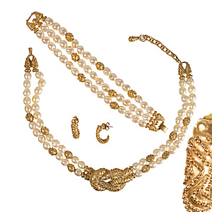 Lot: Jewelry by TRIFARI, yellow metal, sig. TRIFARI, 1 graduated necklace, openwork links with dot ornament, front w = 25.5 mm, with extension chain, l = 41.0-47.5 cm; 1 brooch, SHEET with pearl setting, approx. 44.8 x 52.5 mm; 1 pair of earclips with cream-coloured enamel lacquer, h = 34.0 mm