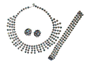 Lot: 3-piece rhinestone set by Kramer, white-coloured metal, signed KRAMER (NY, USA), mirrored rhinestones, bracelet with box clasp, L = 18.0 cm, W = 19.0 mm, necklace, L = approx. 40.0 cm, ear clips, D = approx. 25.0 mm