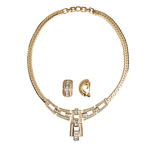 Set aus Collier und Ohrclips, Metall gelbfarben, farbloser Strassbesatz, signiert Grossé Germany (Henkel & Grosse, Pforzheim), Collier vorne H = 44,0 mm, L = ca. 41,0 cm; Ohrclips H = 23 mm