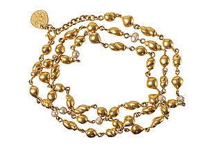 Kette, GOLDETTE, Metall goldfarben, signiert, mehrreihige Kette, in den zwei äußeren Ketten sitzen aufgelockert farbloser Strass, in der mittleren Kette ein Intaglio mit dem Bildnis des Amors und einer Göttin die einen Pfeil in der Hand hält, D = 30,0 mm, Kette, L = ca. 60,0 cm