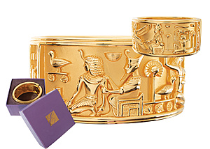 Armspange mit Ägyptischen Motiven, Metall gelbfarben, signiert Elizabeth Taylor for AVON, umlaufende Szenen von ägyptischen Gottheiten und Symbolen u. a. Horusfalke, Anubis, Ank-Zeichen, Udjat-Auge und viele mehr, innen 69,0 x 57,0 mm, B = 38,5 mm, sehr schöner Zustand, mit Schatulle !