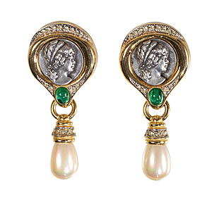 Dekorative Ohrclips von DAVID GRAU, Metall gelbfarben, signiert David Grau, relieffierte Münzen mit Frauenkopf nach rechts, grüner Cabochon, abgehängte Kunstperlen-Tropfen mit farblosem Strassbesatz, H =, 67,0 mm