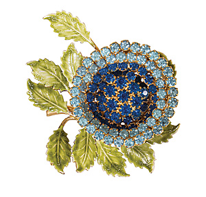 Extravagante Brosche von VENDOME, Metall gelbfarben, signiert Vendome (USA), dunkelblaue und hellblaue Strasssteine, grün emaillierte Blätter, ca. 54,5 x 57,0 mm