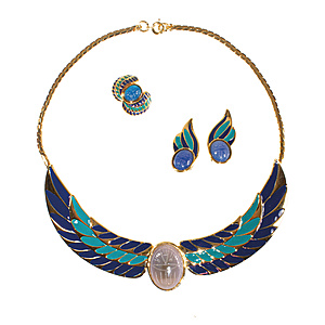 Lot: FRANKLIN MINT; 1 dekoratives Collier (halsnah), signiert FM 87 mit der Bezeichnung: JUWEL OF THE NIL, blau-türkisfarbene Emaille-Auflage, Ägyptischer Stil mit einem Skarabäus in Edelstein-Optik, vorne H = 28,2 mm, L = 40,0 cm (Abhängung fehlt). Passend dazu 1 Paar Ohrclips H = 32,0 mm u. 1 Ring, sig. 89FM, RW ca. 54,5