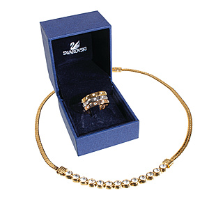 Lot, Schmuck von SWAROVSKI: 3 Ringe, gelb, weiß u. rot mit farblosem Steinbesatz, RW ca. 54,5; 1 Collier, Mittelteil besetzt mit 13 funkelnden Steinen, L = 41,0 cm