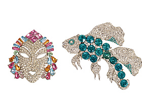 Lot: Decorative brooches, American ART-DECO, white metal, oriental MASK, colourful clear rhinestones around the face, approx. 52.5 x 59.5 mm; FISH, turquoise and clear rhinestones, approx. 85.0 x 76.0 mm