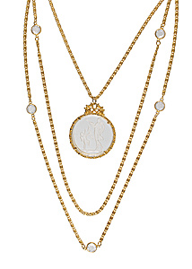 Necklace, GOLDETTE, metal gold-colored, signed, multi-row necklace, the two outer chains are decorated with colorless rhinestones, the middle chain has an intaglio with the image of Cupid and a goddess holding an arrow in her hand, D = 30.0 mm, chain, L = approx. 60.0 cm