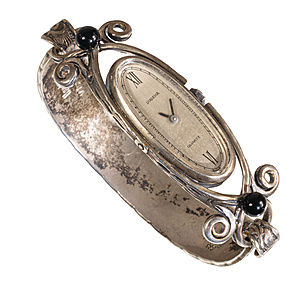 Ladies' watch (hoop), DUGENA, SILVER 835/000, sig. HELMUT V. KLEIST WORPSWEDE, case and clasp decorated all around, inside approx. 53,0 x 40,5 mm, total 33,3 g, watch running !