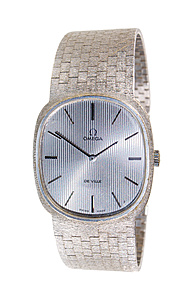 Herren-Armbanduhr, OMEGA DE VILLE, Handaufzug, WG 750/000, Ziffernblatt mit zarten Streifen, ovales Gehäuse ca. 28,8 x 30,0 mm, Werk rotvergoldet, Kal. OMEGA 620, Klappschließe, L = 19,5 cm, Uhr läuft, total ca. 78,8 g