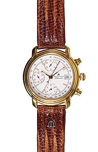 Herren-Armbanduhr um 1995, MAURICE LACROIX Les Mécaniques, Chronograph, goldfarbenes Gehäuse, kl. Sek. auf 9 Uhr, Dat. auf 3 Uhr, Tachymeterskala, gedr. Stahlboden, D = 38,0 mm, Kaliber Valjoux 7750, Ref. 03274, Original Lederband mit Original Schließe, Uhr läuft !