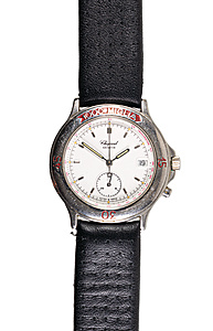 Wristwatch, CHOPARD Mille Miglia, quartz, white dial, stick index, date at 3 o'clock, tachymeter scale, stop function (cent. sec. with sub-dial for 30-minute counter), screwed back, D = approx. 33.5 mm, case N° 266361, Ref. 8141, leather strap with pin buckle