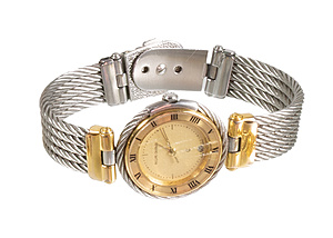 Ladies' wristwatch, signed: PHILIPPE CHARIOL, stainless steel in rope design, gold-plated end pieces, quartz, cent. Sec., date at 6 o'clock, roman index, d = 26,5 mm (without crown), patent clasp, untested !