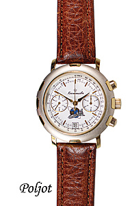 Herren-Armbanduhr, KOSMONAUTEN Chronograph von POLJOT, Handaufzug, Strichindex, kl. Sek. auf 9 Uhr, Datumsfenster auf 6 Uhr, Metallgehäuse, gedr. Boden, D = 39,8 mm, limitiert: Nr. 077/500, Lederband mit Dornschließe, Uhr läuft !