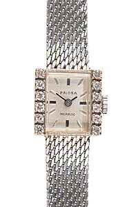 Ladies' wristwatch, WG 585/000, signed PRIOSA, 12 brilliant-cut diamonds approx. 0.30 ct white, square case approx. 15.0 x 15.0 mm, hinged clasp, L = 18.4 cm, total 29.8 g