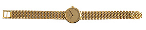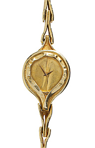 Designer Damen-Armbanduhr, Handaufzug, GG 585/000, gestaltetes goldenes Ziffernblatt, verschr. Boden, D = my-förmige Armbandglieder aus hochkant gestelltem Blech, integriertes Kastenschloss mit Sicherheitsacht, L = 19,0 cm, Uhr läuft, total 50,9 g