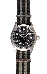 Herren-Armbanduhr, HAMILTON KHAKI FIELD DAY DATE AUTO, Automatik, schwarzes Ziffernblatt, Stahl, zent. Sek., arab. Index, Dat. auf 3 Uhr, Saphirglas, verschr. Boden, D = 38,0 mm (ohne Krone), Kal. H-30 (Gangreserve bis 80 Std.), Textilband mit Dornschließe, Uhr läuft