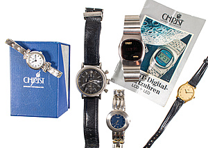 Lot: 5 Uhren von CHRIST, Stahl/Stahl Gold, 2 kl. Damenuhren; 1 Halb-Spange mit Metallband D = 32,0 mm; 1 Digital u. 1 Chronograph D = 43,0 mm, Uhren ungeprüft !!