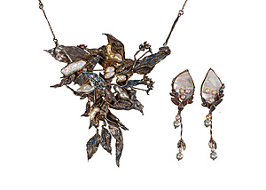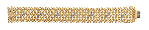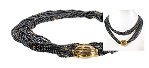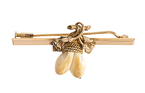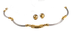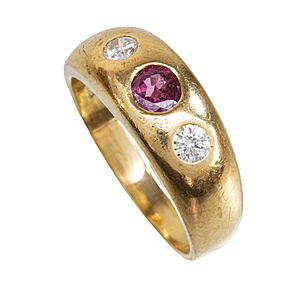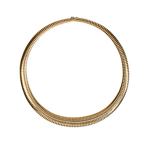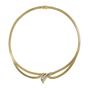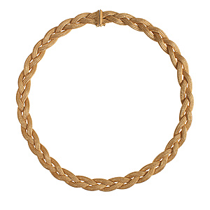 Collier mit dekorativen Mittelteil, GG 585/000, zentraler Opal (Australien) ca. 7,5,0 ct (17,0 x 13,0 mm), lebhaftes Farbenspiel in vorwiegend roten Farbtönen, Turmalincabochon ca. 4,3 ct (10,2 x 8,8 mm), 2 Brillanten 0,06 ct, w-si, Zopfkette mit Karabiner, L = ca. 45,0 cm, Opal mit Trocknungsriss), total 14,6 g